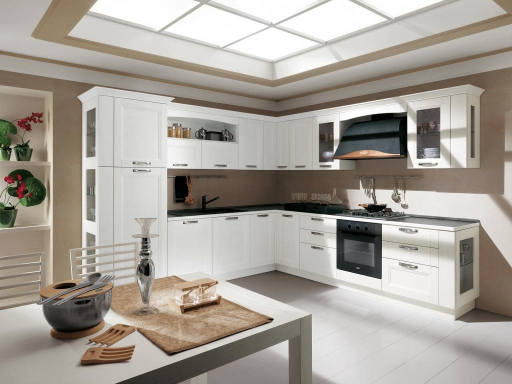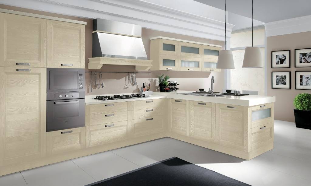 Giulia un progetto accurato è rifinito in ogni sua parte: i terminali si completano di telai a giorno e ripiani in vetro, gli zoccoli e le cornici sono abbinati nella finitura alle ante e i vani a giorno dei pensili sono rifiniti con fascia sagomata.
